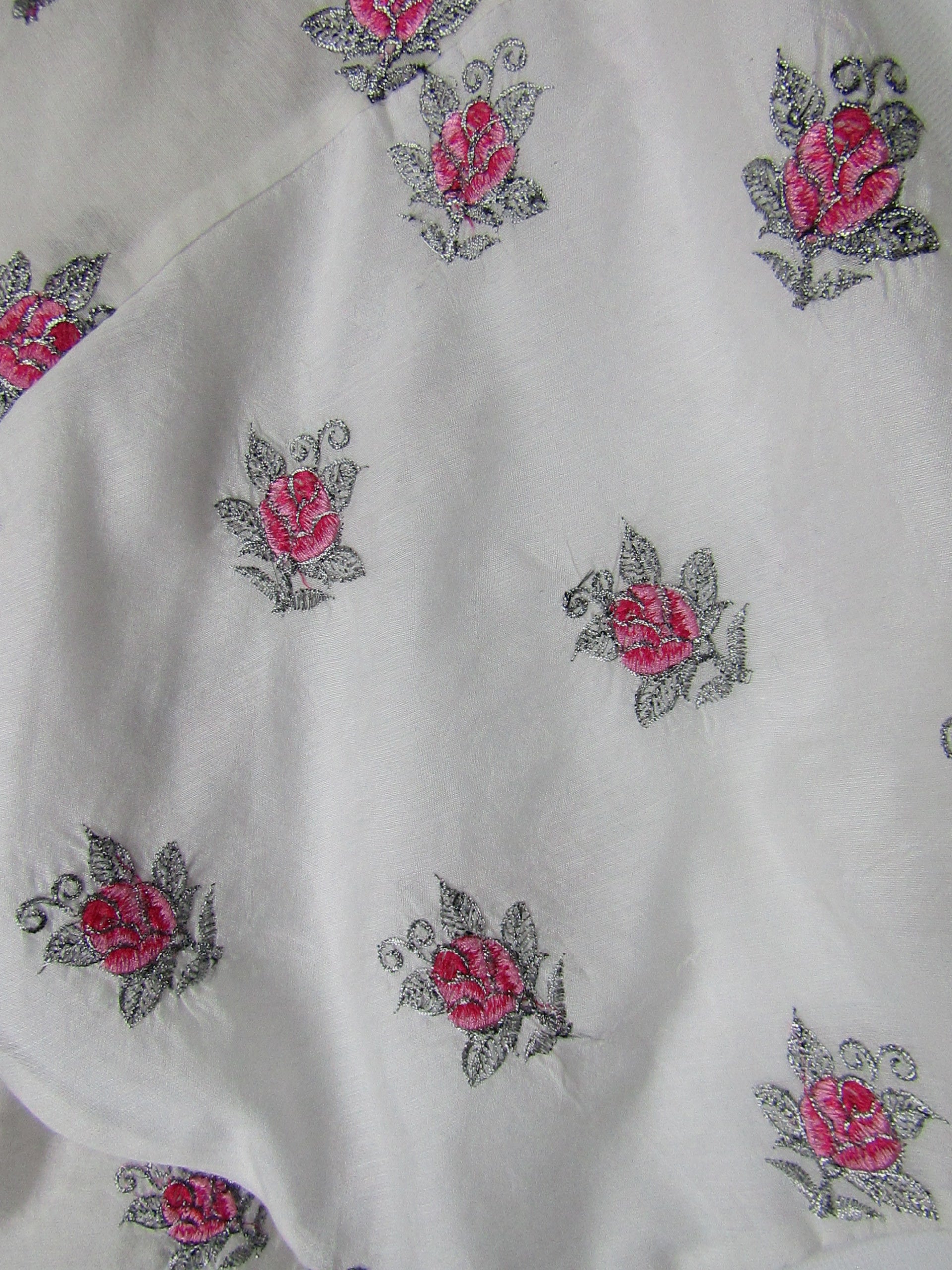 Elegant silk kimono featuring delicate pink floral embroidery and a flowing open-front design.